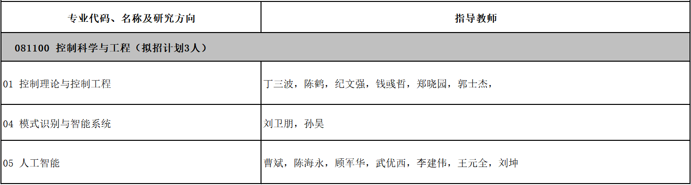 081100控制科学与工程(学术型硕士)、081200计算机科学与技术(学术型硕士)、085404计算机技术(专业学位硕士)、085406控制工程(专业学位硕士)、085410人工智能(专业学位硕士)、081100控制科学与工程(博士)。接收推免生的学习形式为全日制,录取类别为非定向,直博生基本学制五年。
