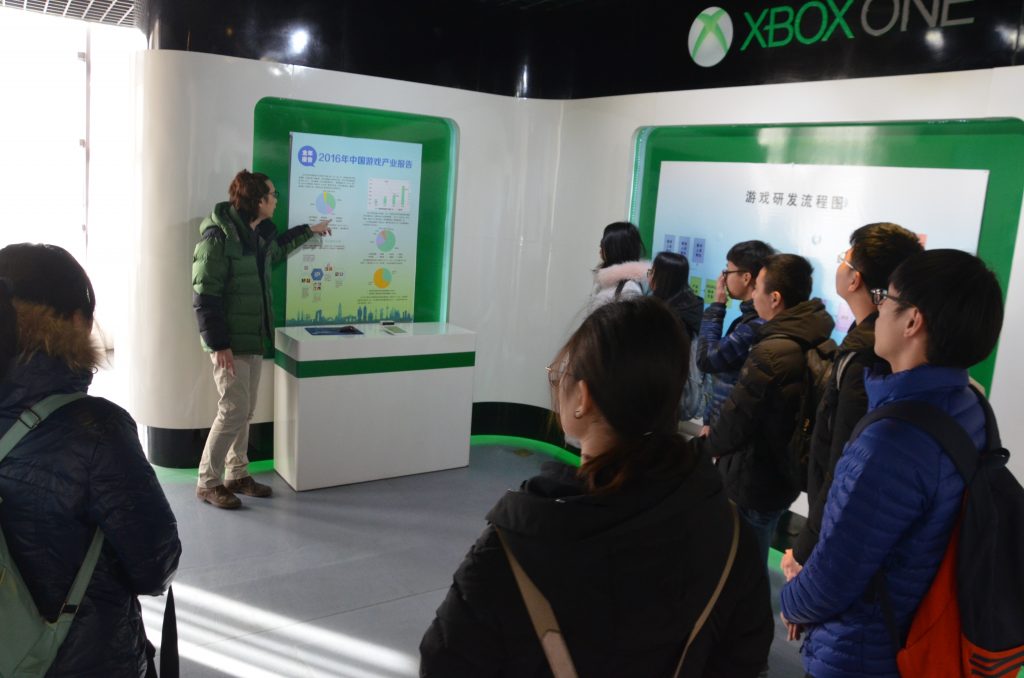 在园区老师的带领下,同学们参观了游戏展示区,面对这个熟悉而又陌生的领域,同学们仔细聆听讲解,认真思考,填补知识空白。高端大气的游戏体验区为大家展示了各式各类的游戏产品,包括端游、页游以及新式的虚拟游戏,同学们动手操作、亲身体验,极佳的游戏体验让同学们乐在其中。大学生作为最主要的游戏玩家群体,这是揭开游戏背后秘密的良机,同学们了解到关于游戏开发流程方面的知识,包括前期团队组建、模型构建、设计开发、游戏测试、产品上线等,看似十分简单的流程,却需要一个有能力的团队历经坎坷才能成功。在移动游戏的崛起和推动下,近三年全球游戏市场规模继续保持两位数增长,作为计算机专业的学子,掌握游戏设计开发的整个过程,也为未来就业创业拓宽了一个重要渠道。