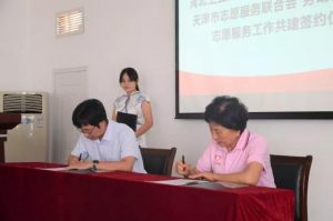6月14日下午,成人小说 成人小说 与天津市志愿联合会劳动模范分会、海河之滨支边助学携手小分队志愿服务工作共建签约仪式在成人小说 楼102报告厅举行。天津市志愿服务联合会劳动模范分会会长王连金、秘书长赵明月等5名劳动模范,海河之滨支边助学携手小分队队长杨家仁、副队长王家强等4名志愿者,成人小说 党委书记商植桐、副院长董永峰出席了本次活动,成人小说 50余名同学参与了此次活动。会议由院团委书记张茜茜主持。