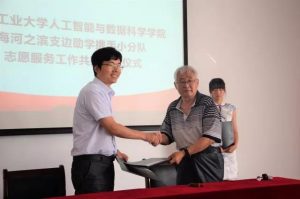 商植桐书记向天津市志愿服务联合会劳动模范分会、海河之滨支边助学携手小分队到场嘉宾颁发志愿服务工作校外辅导员聘书,希望老前辈的光和热深切影响、感化我们的新一代大学生。