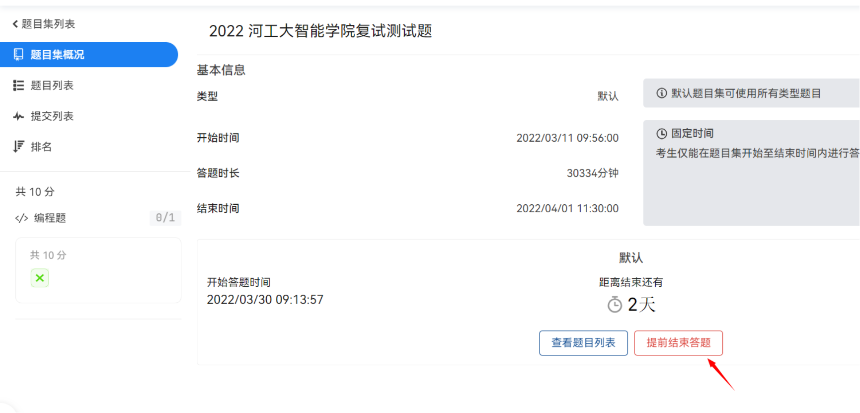 考试时间为60分钟,系统会自动倒计时,如若想提前交卷,请点击左侧 “题目集概况”,提前结束答题,并在对话框内输入灰色文字 “不可恢复” “失去” “提交”