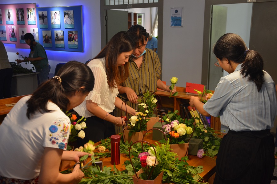 在插花活动中,全体教职工亲自动手,经过约2个小时的挑选、修剪、插植,一盆盆错落有致、生机盎然的插花作品展现在大家眼前,看着通过自己双手制作成的插花作品,大家脸上都洋溢着喜悦的笑容,纷纷用相机记录下这精彩瞬间。