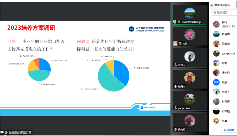 首先,计算机类(计算机科学与技术、软件工程、物联网工程)、自动化、人工智能、数据科学与大数据技术六个专业负责人分别对2023版本科人才培养方案制定进展情况进行汇报。各专业对2019版本科人才培养方案执行情况进行了总结,对2023版培养方案修订调研情况进行了梳理,并就各专业建设情况以及在人才培养方案修订工作中遇到的问题及困惑进行了逐一说明。