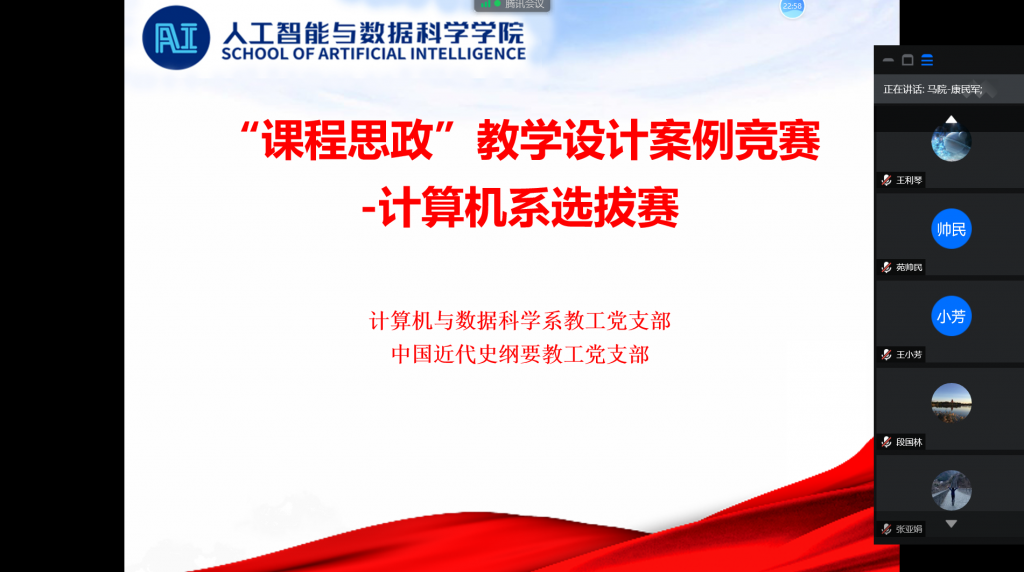 为落实“立德树人”根本任务,实施“铸魂育人”工程,提升教师课程思政建设的意识和能力,不断优化课程思政案例设计,切实把思想政治工作贯穿教育教学全过程,6月26日—29日,成人小说 与马克思主义成人小说 十个“结对共建”的教师党支部开展了线上“课程思政+思政课程”集体备课暨思政课教师指导专业课教师优化课程思政案例设计的教学研讨活动,成人小说 领导班子成员深入各教学部门参加活动。联系计算机与数据科学系教师党支部的校党委常委、副校长段国林参加了本次活动并予以指导。