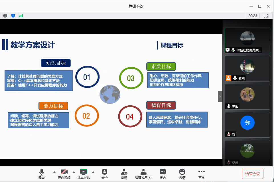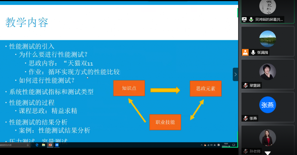 智能与物联网系、智能基础教研部的教师们分别从课程的基本情况介绍、教学大纲要求、教学目标设定、教学内容梳理到课程思政的教育目标、思政元素挖掘、案例遴选,再到与专业教学内容的融合点以及教学过程和方法的衔接,进行了细致介绍,体现了在“润物无声”的知识传授中融入理想信念层面的价值引领,将课程思政环节涵盖到教学过程整个环节。