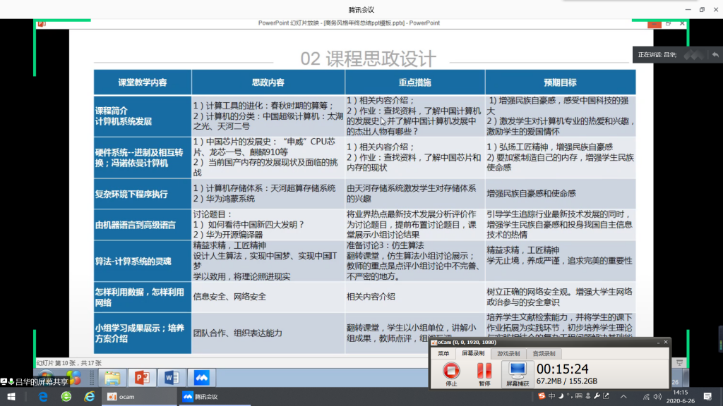 计算机与数据科学系田红丽老师在《计算机组成原理》课程中,通过指令发展趋势引导学生掌握事物螺旋上升的发展规律;针对我国计算机产业缺芯(CPU)少魂(OS)问题,结合2018年的中兴事件、华为事件,教育学生要明白自己所肩负的责任和使命。中国近代史纲要党支部书记刘永春和该教研室主任、校教学督导高京平在点评时提到,不同的课程有不同的特点,课程思政的设计要做到“形散神不散”,“神”就是立德树人,“形”是具体的课程,思政元素要融入到专业课中,需要对课程的安排进行细化,设立不同层次的目标,最终实现立德树人的目标。